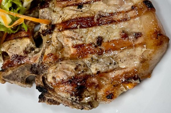 Costata di maialino paesano cotta ai carboni e servita con contorno capriccioso del contadino.